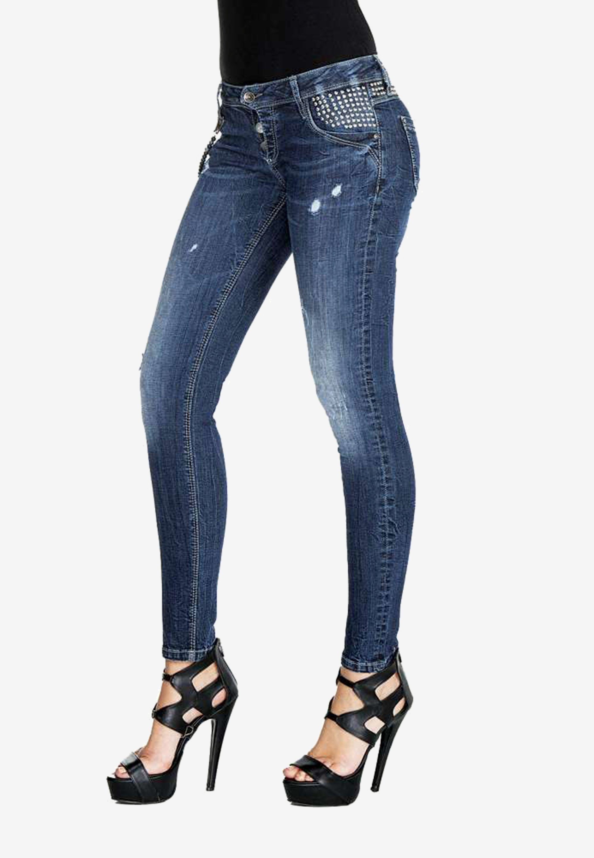 Seventyseven Lifestyle Damen Skinny Jeans Hose 5 Pockets Breiter Bund Dirty Wash Blau