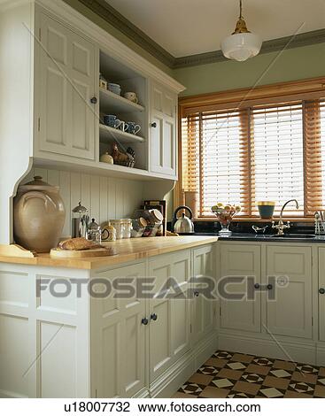 Slatted Holzern Blenden Auf Fenster In Kueche In Traditionelle Pastell Grune Kuche Malen In Farrow Ball Farbe Stock Bild U Fotosearch