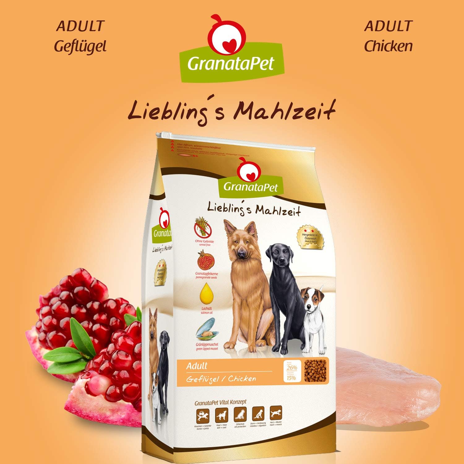 HighPremium Trockenfutter für ausgewachsene Hunde, getreidefrei, mit Grünlippmuschel, Granatapfelkernen & funktionellen Inhaltsstoffen, nur eine tierische Proteinquelle, ohne künstliche Zusätze GranataPet Liebling's Mahlzeit Adult Geflügel bietet eine ganzheitliche, ausgewogene und besonders schmackhafte Hundenahrung für ausgewachsene Hunde aller Rassen. GranataPet Liebling’s Mahlzeit Hund Trockenfutter Adult ,99 € inkl 19 % MwSt Ohne Getreide;. GranataPet legt bei seinem Futter hohen Wert auf ausgewählte Fleischsorten wie Lamm, Ente, Pute, Fisch oder Kaninchen Jedes Futter von GranataPet enthält die positive Wirkung des Granatapfels Hund Trockenfutter Nassfutter Snacks.