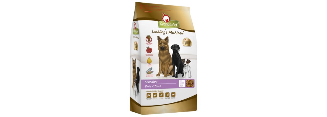 Für ein langes und fittes Hundeleben c mit Granatapfelkernen c ohne Zuckerzusatz c artgerechte Tiernahrung von GranataPet. GranataPet Nassfutter für Hunde GranataPet Hundefutter verzichtet bei der Herstellung gezielt auf Getreide und setzt ganz bewusst auf hochwertige Fleischsorten wie Lamm, Ente, Geflügel, Pute, Fisch oder KaninchenMit GranataPet Trockenfutter versorgen Sie Ihren Vierbeiner mit allem, was er für ein gesundes, glückliches und langes Leben benötigt. GranataPet Liebling's Mahlzeit Sensitive Ente 4kg HundeTrockenfutter von Granatapet mit Vitaminen Mit hochwertiger Ente für den feinen Gaumen Das Futter ist speziell auf die Bedürfnisse von Senioren, ausgewachsenen Hunden und jungen Hunden angepasst.