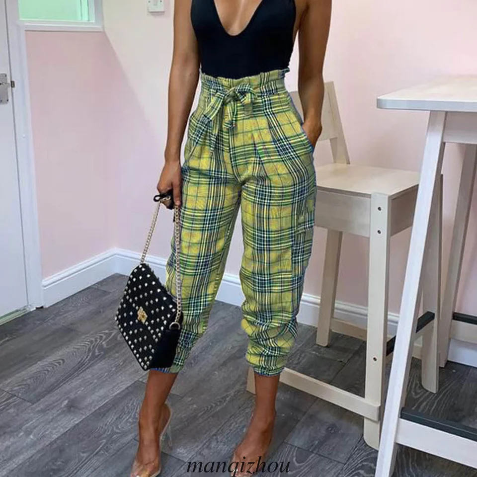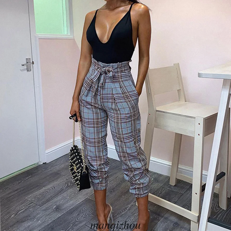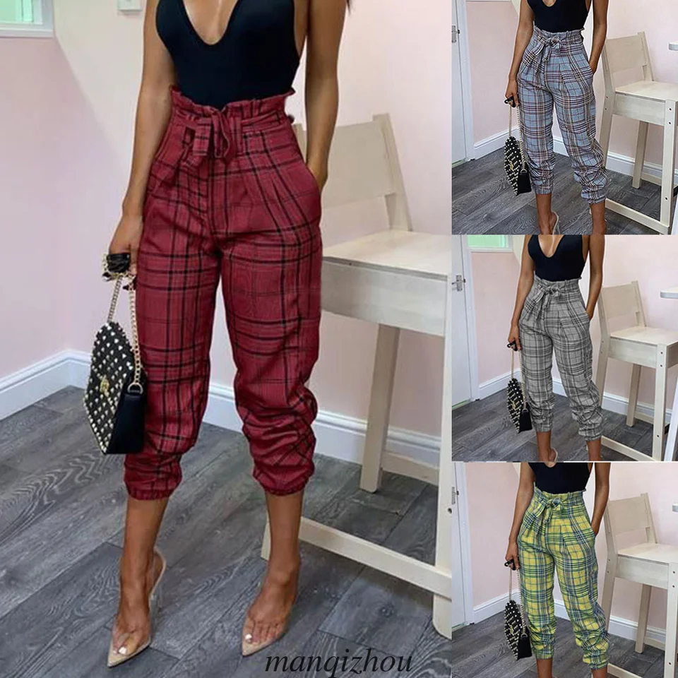 Damen High Waist Check Plaid Hosen Casual Office Ol Belted Haren Lange Hosen Pants Capris Aliexpress