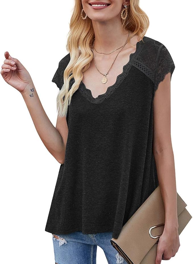 Plunge Damen Blusen Chiffon T Shirt Kurzarm V Ausschnitt Spitzen Tops Shirts Tunika Falten Oberteile Sommer Amazon De Bekleidung