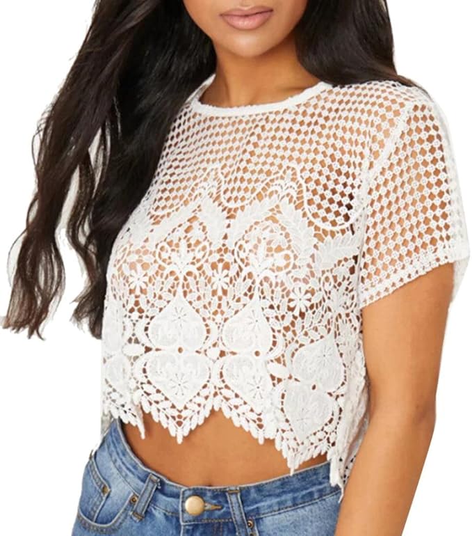 Goosuny Damen Bluse Mit Spitze Halbarm Oberteile Elegante Kurze Spitzentop Weiss Blusenshirt Aushohlen Bauchfreie Tops Loose Schone T Shirt Strand Tops Spitzenbluse Amazon De Bekleidung