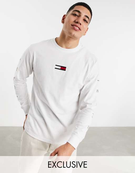 Tommy Jeans Exklusiv Bei Evesham Nj Weisses Langarmliges Oberteil Mit Flagge Vorne Und Charakteristischem Aufdruck Auf Dem Rucken In Lockerer Passform Evesham Nj