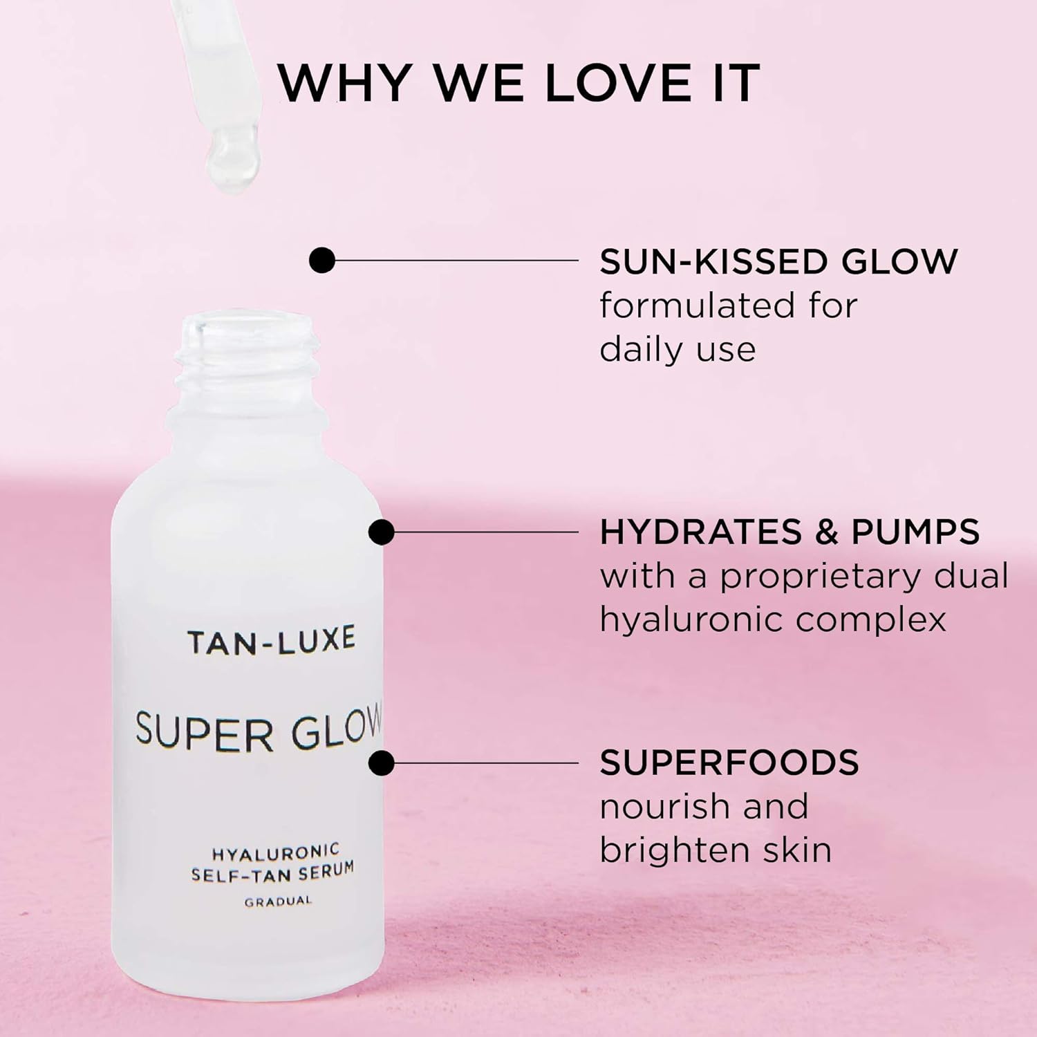 TANLUXE Super Glow Hyaluronic Self Tan Serum combines the greatest in gradual tanning with a powerful complex of a Hyaluronic Hybrid and 7 Superfoods for the first supercharged, multipurpose serum Containing a complex of Hyaluronic Acid & extremely low molecular weight Sodium Hyaluronate, these 2 high performance ingredients combine for a. TANLUXE Super Glow is a hyaluronic super serum that hydrates while nourishing, superfood ingredients work to even skin tone, colorcorrect and minimize pigmentation all with the ability to customize your glow Cocoa seed extract shields skin from environmental aggressors, while the lightweight formula melts into skin. Super Glow is the World’s first hyaluronic, superfood selftan serum Think your best skin day ever, bottled A gradual sunkissed glow formulated for daily use, the lightweight hyaluronic complex quenches & plumps skin.