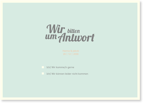 Antwortkarte zur Hochzeit Für die Organisation eures großen es ist es sehr wichtig, dass ihr rechtzeitig wisst, ob die geladenen Hochzeitsgäste kommen können oder nicht Eine Antwortkarte beliegend zur Hochzeit Einladung unterstützt dabei In der Einladung für die Hochzeit steht meist Um Antwort wird gebeten. Wenn man seine Hochzeit in einem kleineren Rahmen halten möchte, ist es deswegen zu überlegen, den bzw die Namen der eingeladenen Gäste bereits auf die Antwortkarte zu schreiben Damit entfällt die Frage nach der Begleitperson und man lädt tatsächlich nur die Gäste ein, die man auf seiner Gästeliste hat. Die Antwortkarte für die Hochzeit wird oft im PostkartenFormat erstellt, da es für alle nötigen Informationen Platz bietet und ohne Couvert zurückgesendet werden kann Auf der Vorderseite der Antwortkarten für die Hochzeit können Sie je nach Layout ein Foto einfügen oder das Design so übernehmen, wie es ist.