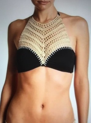 Bikini Lab Halter Tie Black Bikini Top With Beige Crochet Accent Size M New Ebay