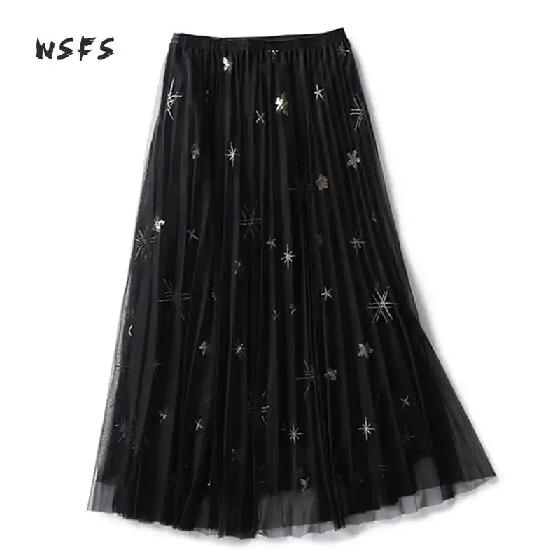 Wsfs Sommer Mesh Plissee Rock Schwarz Weiss Elastische Taille Lange Rocke Frauen Feder Sterne Stickerei Sequied Party Midi Rock Elastic Waist Long Skirts Long Skirtpleated Skirt Aliexpress