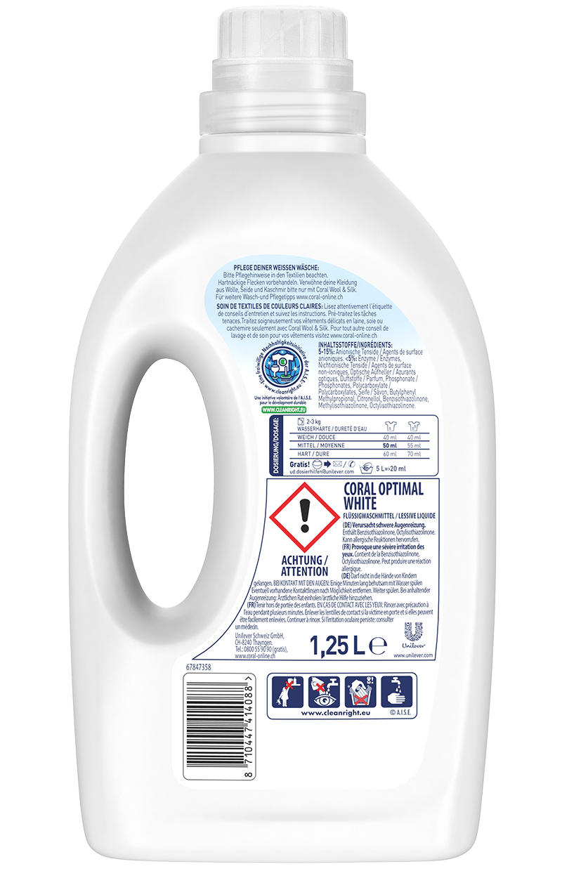 Wird das Waschmittel bei zu niedrigen, zum Beispiel bei der Lagerung in der Garage oder bei zu hohen, wie bei der Lagerung in Heizungsnähe, Temperaturn aufbewahrt, kann es seine Wirksamkeit verlieren Ob ihr Waschmittel noch verwendbar ist, erkennen sie an den drei Faktoren Geruch, Aussehen und Beschaffenheit. Möchten sie Ihre Wäsche so weiß, wie am ersten tragen?. Weiß bleibt Weiß Mit dem Coral Feinwaschmittel für weiße Wäsche Das Waschmittel reinigt fasertief schon bei niedrigen Temperaturen und verhindert, dass Ihre Kleidung vergilbt Das Weiß Ihrer Wäsche behält seine natürliche Strahlkraft.