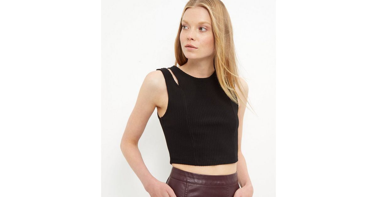 Schwarzes Geripptes Kurzes Oberteil Mit Zierausschnitt An Den Schultern New Look