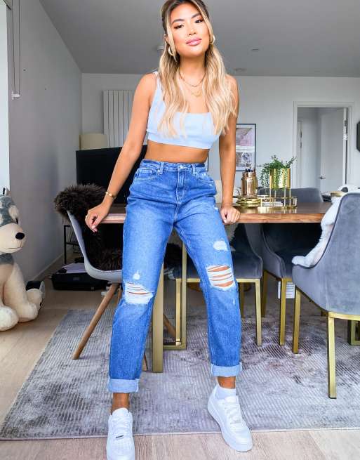 Mittelblaue Mom Jeans Im Destroyed Look Topshop