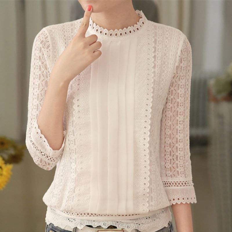 Grosshandel Frauen Herbst Lassig Weisse Spitze Bluse Mode Sexy 3 4 Armel Stehen Kragen Hakeln Tops Sommer Koreanische Hemd Kleidung Von Tanzhilian1 19 02 Auf De Dhgate Com Dhgate