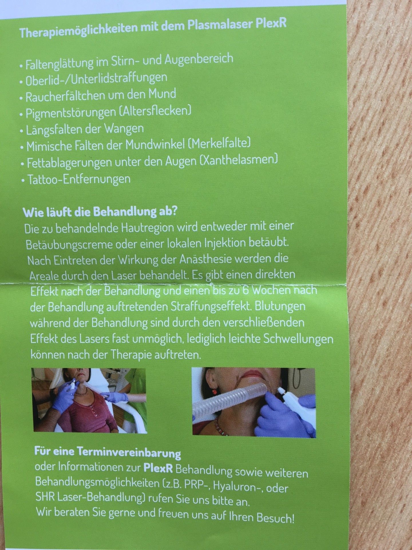 Hallo Emmy , da mich persönlich auch Oberlippenfalten plagen , war ich bei meinem Besuch im schönen Düsseldorf in einem Fachzentrum für medizinischästhetische Haut und Lasertherapie , wo unter anderem die PlexR Behandlung durchgeführt !. Ästhetische Chirurgie Düsseldorf Faltenbehandlungen & Lasermedizin Faltenbehandlungen bieten Ihnen nicht nur die wunderbare Möglichkeit, selbst tiefe Falten zu glätten, sondern beugen auch der weiteren Faltenbildung vor Filler und Co erfreuen sich einer überragenden Beliebtheit, da sie den Wunsch nach Jugendlichkeit effektiv und zugleich sanft sowie nahezu nebenwirkungsfrei erfüllen. Zu 90% ist eine Sitzung ausreichend, selten wird eine Wiederholung erforderlich, vorausgesetzt, man hat ausreichend Erfahrung mit der Methode Gerne kann man hier den Blick mal hinwenden schauen Sie nach PlexR lasaderm lips oder PlexR smoker lines Das deckt sich mit meinen Erfahrungen, selbst bei größeren Arealen, wie dem gesamten Hals.