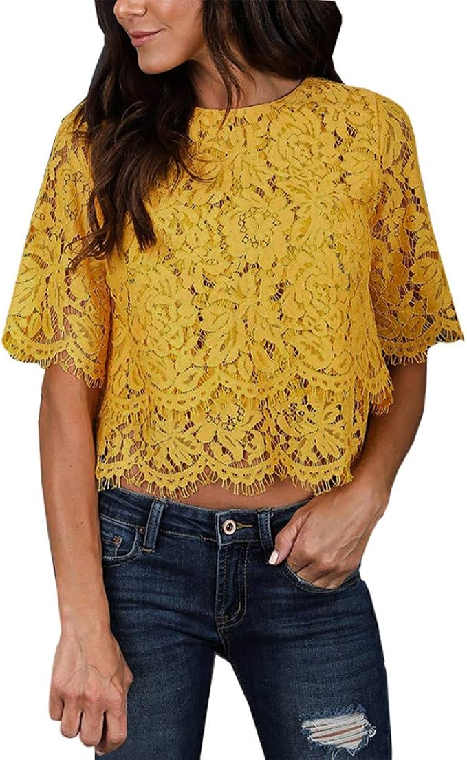 Andouy Damen Kurzes Oberteil Aus Spitze Mit Blumenmuster Und Blumenmuster Kurzarmliges Hemd Gr 36 42 Sexy Party Bluse Amazon De Bekleidung