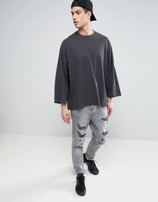 Asos Extremes Oversize T Shirt In Kastenform Mit Weiten 3 4 Armeln In Verwaschenem Schwarz Asos