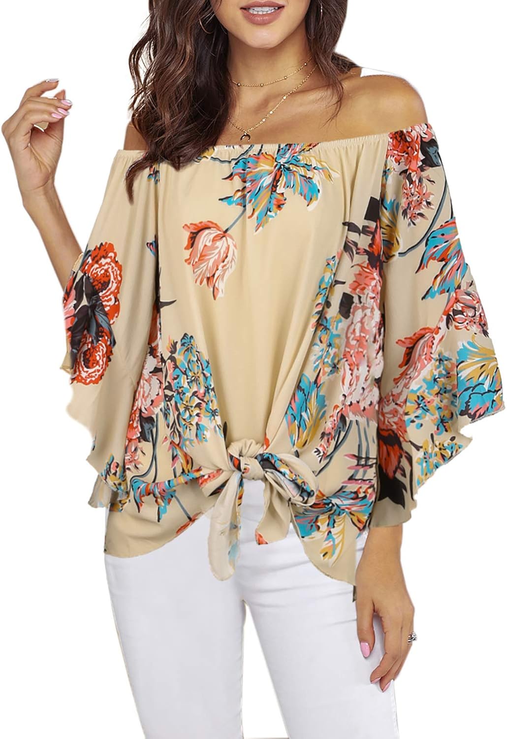 Amazon Com coco Women S Floral Printed Off The Shoulder Blouse Tops Striped Tie Knot 3 4 Flare Sleeve Shirts Clothing
