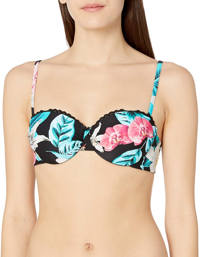 Bustier style bikini top Allover print with contrasting colored printed trim on cups Molded cups with sweetheart neckline Threeway back hook closure. A bustier looks similar to a corset, but typically extends only to the base of the ribs or waist and is intended for pushing up a woman's breasts Boning and underwire are built in to each bustier to provide nextlevel structure and support, effectively slimming the midsection while boosting the bust at the same time. Beautiful floral lace Semitransparent allover mesh Builtin strapless pushup underwire bra (no straps included) Boning for support Hook & eye back closure ;.