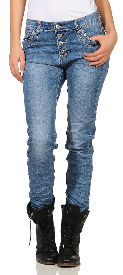 Karostar Damen Jeans Hufthose Baggy Pants Chino Lange Hose Knopfe Denim 26 Damen Jeans