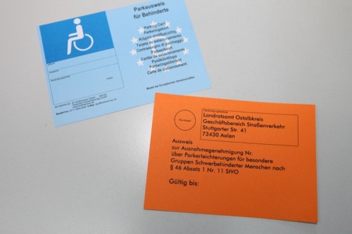 Schwerbehinderte Menschen mit einer außergewöhnlichen Gehbehinderung (Merkzeichen aG), beidseitiger Amelie oder Phokomelie oder mit vergleichbaren Funktionseinschränkungen sowie blinde Menschen können eine Ausnahmegenehmigung ("blauer Parkausweis") erhalten. Das Landesamt für Soziales und Versorgung (LASV) trifft keine Entscheidungen darüber, ob eine Ausnahmegenehmigung nach § 46 StVO (EUParkausweis, orangener Parkausweis) ausgestellt werden kann Hierfür sind ausschließlich die Straßenverkehrsbehörden, die bei den kreisfreien Städten und Landkreisen angesiedelt sind, zuständig. Blauer EUParkausweis Seit dem ist die Kennzeichnung von Behindertenparkplätzen bei allen Mitgliedstaaten der Europäischen Union (EU) einheitlich geregelt Seither gibt es auch den blauen EUParkausweis für Menschen mit Behinderung.