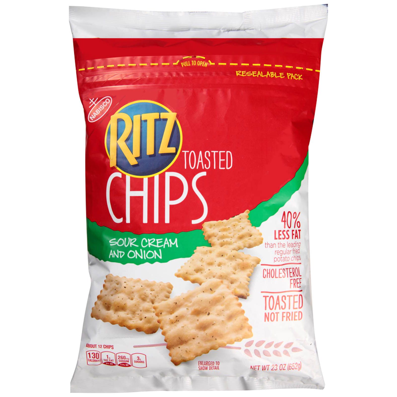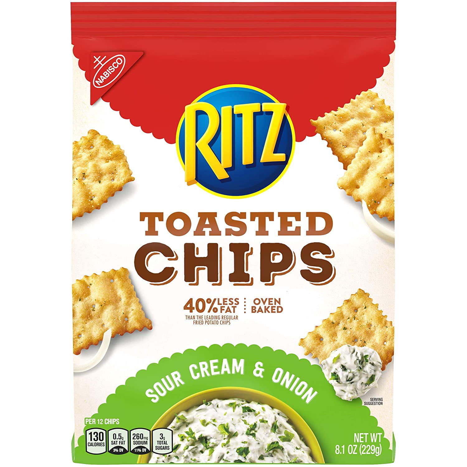 RITZ Toasted Chips Sour Cream and Onion Crackers, 81 oz Product Description RITZ Toasted Chips Sour Cream and Onion Crackers are a crispy, crunchy twist on the classic cracker you know and love, packed with a tangy sour cream and onion. Whether you like sour cream and potato chips, salsa and tortilla chips, hummus and crackers or another favorite combination, chips and dip are a tasty, easy snack However, since you’re usually dipping out of a bowl, it can be hard to keep track of how much you’re eating. RITZ Toasted Chips Sour Cream and Onion Crackers are a crispy, crunchy twist on the classic cracker you know and love, packed with a tangy sour cream and onion flavor These oven baked sour cream and onion chips are toasted, not fried, so they contain 40 percent less fat than leading fried potato chips.