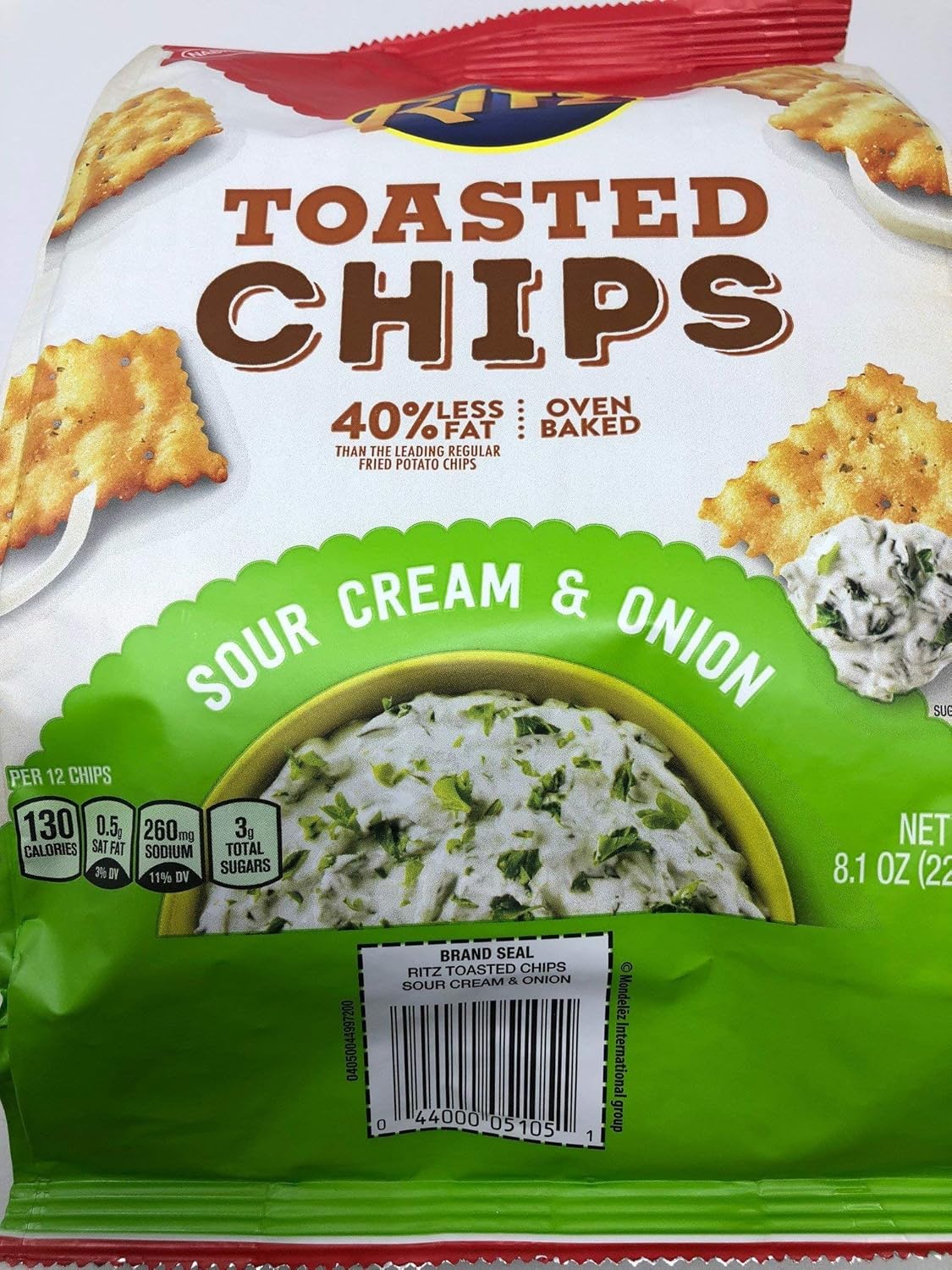 RITZ Toasted Chips Sour Cream and Onion Crackers are a crispy, crunchy twist on the classic cracker you know and love, packed with a tangy sour cream and onion flavor These oven baked sour cream and onion chips are toasted, not fried, so they contain 40 percent less fat than leading fried potato chips. RITZ Toasted Chips Sour Cream and Onion are a crispy, crunchy twist on the classic cracker you already know These oven baked chips are toasted, not fried, so they contain 40 percent less fat than the leading regular fried potato chips and all the flavor of toasted crackers. The sour cream and onion variety have lots of powder on the chip, so you won't mistake that flavor for anything else The "chips" themselves are not Ritz Crackers, they are Ritzcrackerlike, with a few air pockets to make them light, and they have jagged edges to make them look more funky.