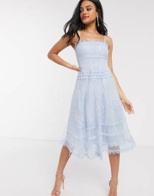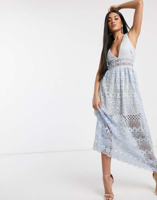 Love Triangle Midikleid Mit V Ausschnitt Und Spitzenlage In Gedecktem Blau Asos
