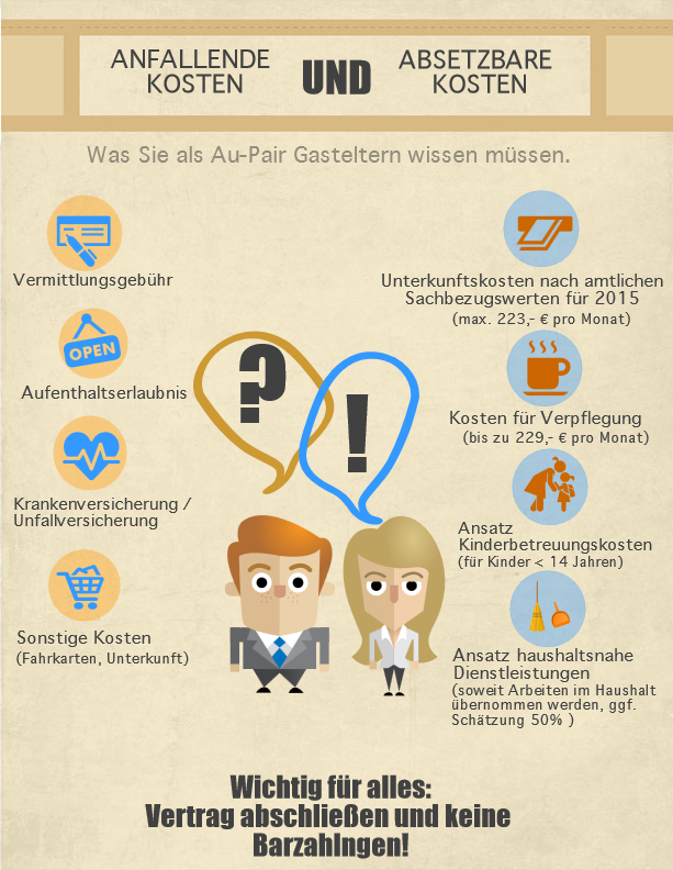 Diese Kosten sollten Sie dennoch nicht abschrecken, einen Gast in Ihre Familie aufzunehmen, denn Sie können die Beschäftigung eines Aupairs bei Ihrer Steuererklärung beachten. Hallo, angenommen Schüler S ( nicht volljährig ) würde an einer von der Schule organisierten, mehrwöchigen Sprachreise ins nicht europäische Ausland. "Um steuerlich als Arbeitszimmer zu gelten, muss es den Charakter eines Büroraumes haben", hält Neumann fest Wird hingegen nur eine Teilfläche eines Raumes für berufliche Zwecke genutzt, liegt schon begrifflich kein Arbeitszimmer vor Frage Können Einrichtungsgegenstände eines Arbeitszimmers im Wohnungsverband steuerlich absetzbar sein?.