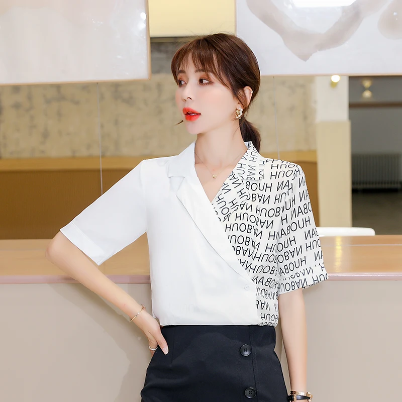 Neue Buro Dame Sommer Blazer Blusen Frauen Vintage Anzug Kragen Weisse Bluse Tops Kurzarm Brief Drucken Schwarz Hemd Tees Blusen Hemden Aliexpress
