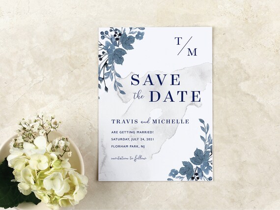 Dusty Blue Flowers Wedding Save The Date Blue Florals Modern Etsy