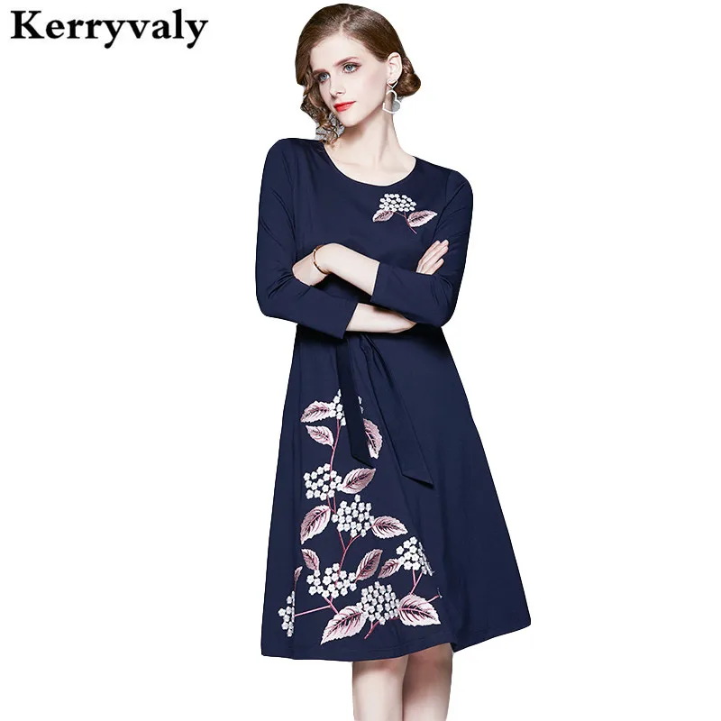 Herbst Langarm Dark Blue Floral Bestickten Kleid Vestidos Casual Mujer Herbst Frauen Midi Damen Kleider Ropa Mujer K6860 Kleider Aliexpress