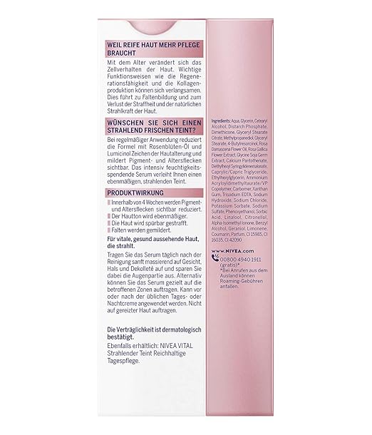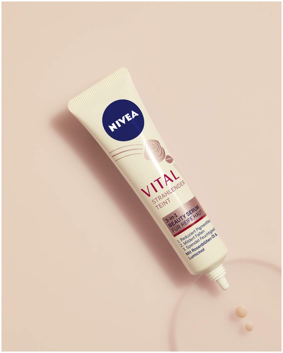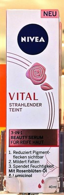 NIVEA VITAL Strahlender Teint 3in1 Beauty Serum ArtNr Inhalt 40 ml 10,95 €. Die Formel mit RosenblütenÖl und Lumicinol reduziert Zeichen der Hautalterung und mildert Pigment und Altersflecken sichtbar Das intensiv feuchtigkeitsspendende Serum verleiht Ihnen einen ebenmäßigen, strahlenden Teint NIVEA VITAL Strahlender Teint 3in1 Beauty Serum. Gel de teint au fini ultra naturel, pour une mine visiblement plus radieuse !!.