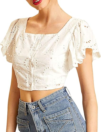iral Crop Tops Damen Schmetterlingshulle Besticktes Kurzes Oberteil Mit Quadratischem Kragen Und Ruschenarmeln Weiss Xl Amazon De Sport Freizeit