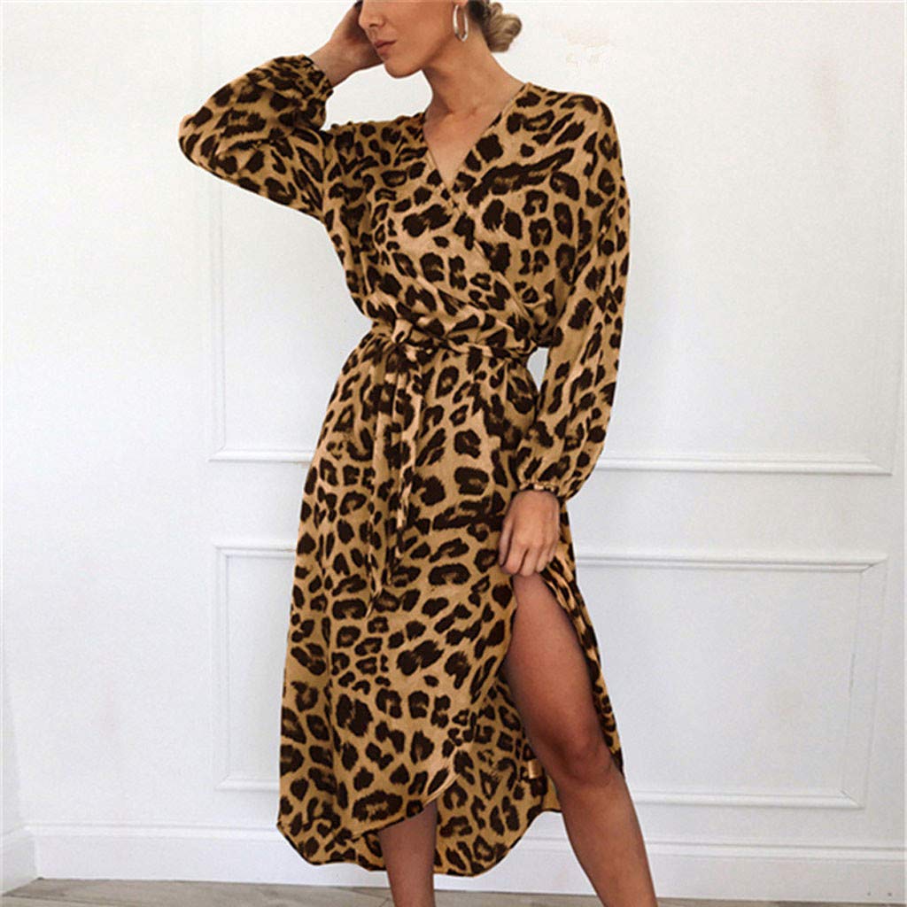 Beikoard Damen Knielang Maxikleid Casual Langarm Langes Kleid Fruhlingskleid Leopard Print Split Abendkleider Schnuren V Ausschnitt Party Kleider