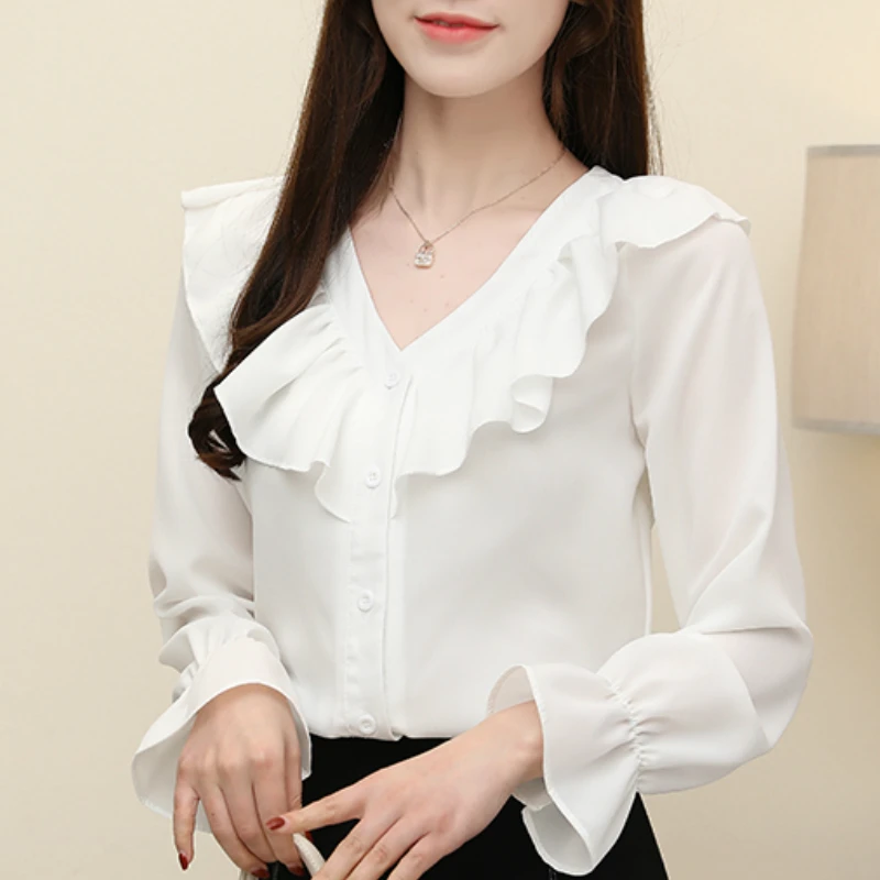 Frauen Tops Und Blusen Langarm Ruschen V Ausschnitt Chiffon Bluse Frauen Tops Blusen Frau 21 Weisse Bluse Damen Tops C290 Blusen Hemden Aliexpress