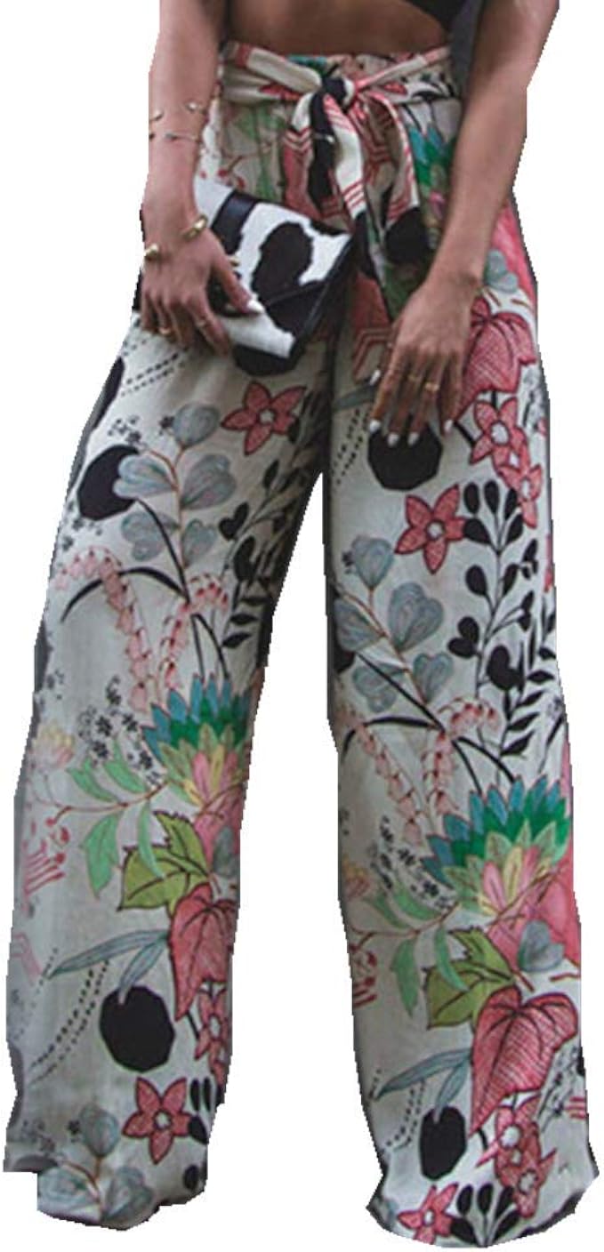 Wozow Damen Blumenmuster Floral Print Ethnic Loose Long Weites Bein Stoffhose Amazon De Bekleidung