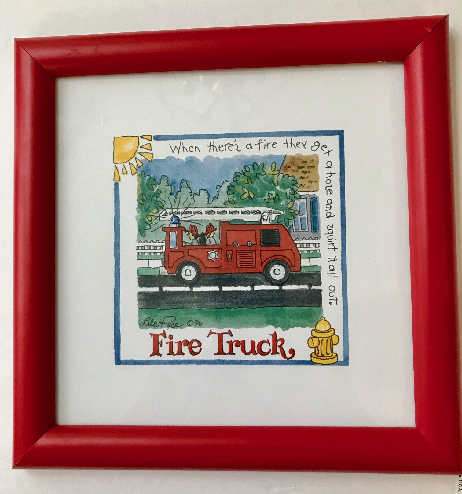 Amazon Com Lila Rose 96 Red Framed Wall Decor Firetruck When There S A Fire They Get A Hose And Squirt It All Out