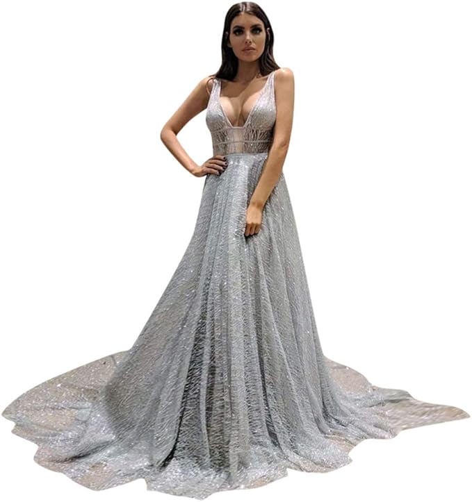 Zapaka Damen Langes A Linie Glitzer Grau V Ausschnitt Pailletten Ballkleider Partykleider Zapaka De