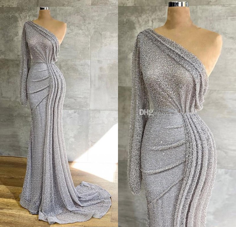 Silber Pailletten Glitzer One Shoulder Schlitz Langarm Enges Maxikleid Abendkleid Ballkleid Maxikleider Kleider Abendkleid Schone Kleider Ballkleid