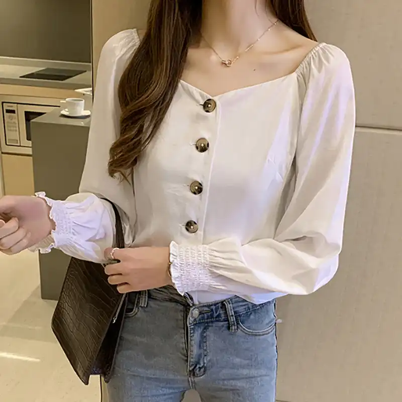 Shintimes Kurze Weisses Hemd Frauen Quadrat Kragen Lange Flare Hulse Chiffon Bluse Taste Herbst Vintage Damen Tops Chemisier Femme Blusen Hemden Aliexpress