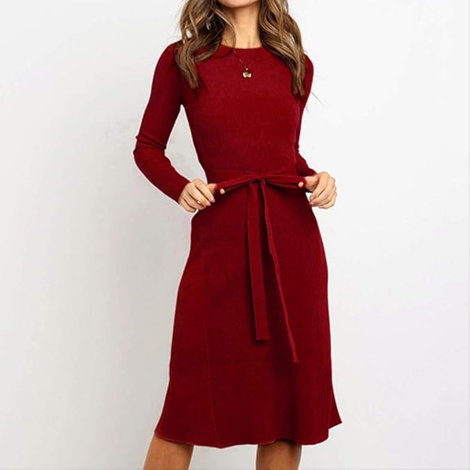 Mnbv Kleid Herbst Winter Strickpullover Kleid Frauen Sexy O Hals Langarm A Linie Kleid Damen Knie Party Kleid Gurtel M Weinrot Amazon De Bekleidung