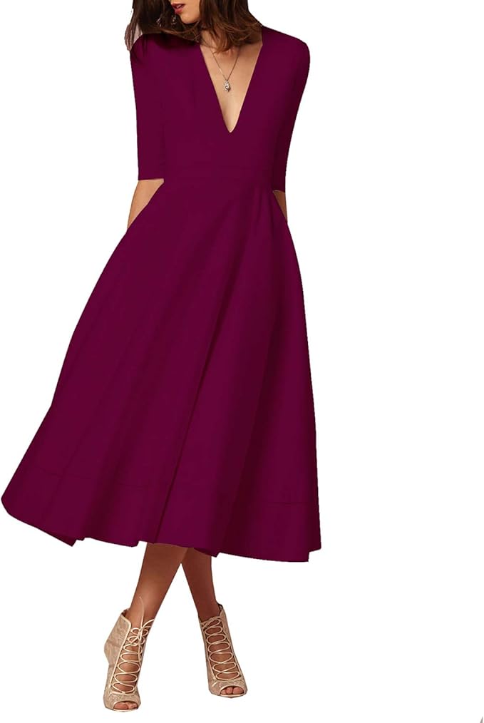 Foluton Kleider Damen Midilang 3 4 Armel Tiefer V Ausschnitt A Linie Beilaufige Lose Swing Kleid Herbst Winter Rundhals Partykleider Casual Elegant Abendkleider Amazon De Bekleidung