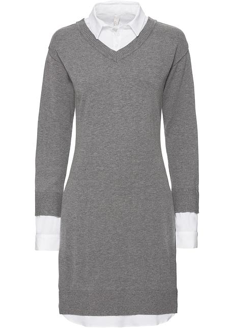 Figurbetontes Strickkleid Mit Bluseneinsatz Grau Weiss