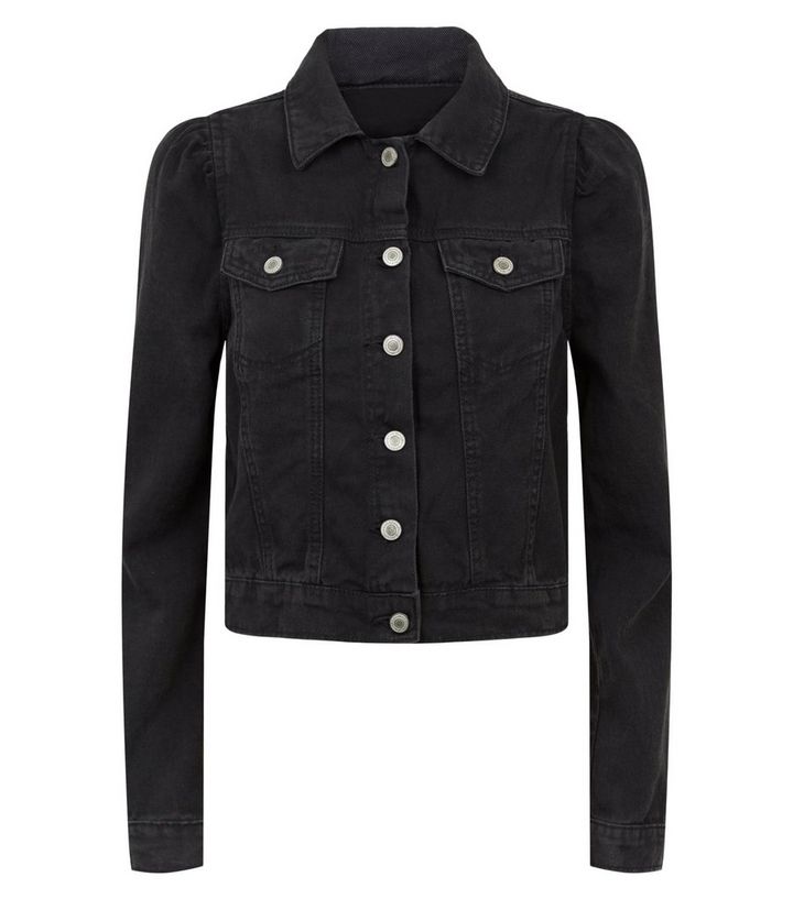 Schwarze Kurze Jeansjacke Mit Puffarmeln Und Betonter Schulter New Look