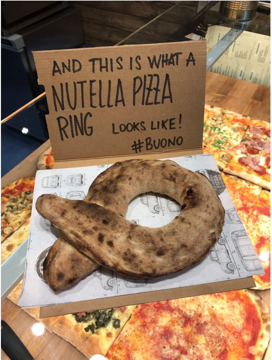 NUTELLA RING £495 The perfect end to your Neapolitan meal Your kit contains enough ingredients to make two delicious rings (or one giant monster!), a crowd pleaser all round with the perfect balance of ricotta and Nutella!. 1 Nutella Pizza Ring Sicilian pizza restaurant Arancina in London’s Notting Hill has created the sweet and savoury combo of our dreams Arancina’s dessert menu features a Nutella Pizza Ring which they say is perfect to share and costs £590 And if that’s not decadent enough for you, they also make a Nutella and Ricotta Pizza Ring for the same price. Cheesy and triplemeatfilled, this crescent ring is like a stromboli only flaky, thanks to the crescent dough Perfect for a large gatheringslice, dip and eat.
