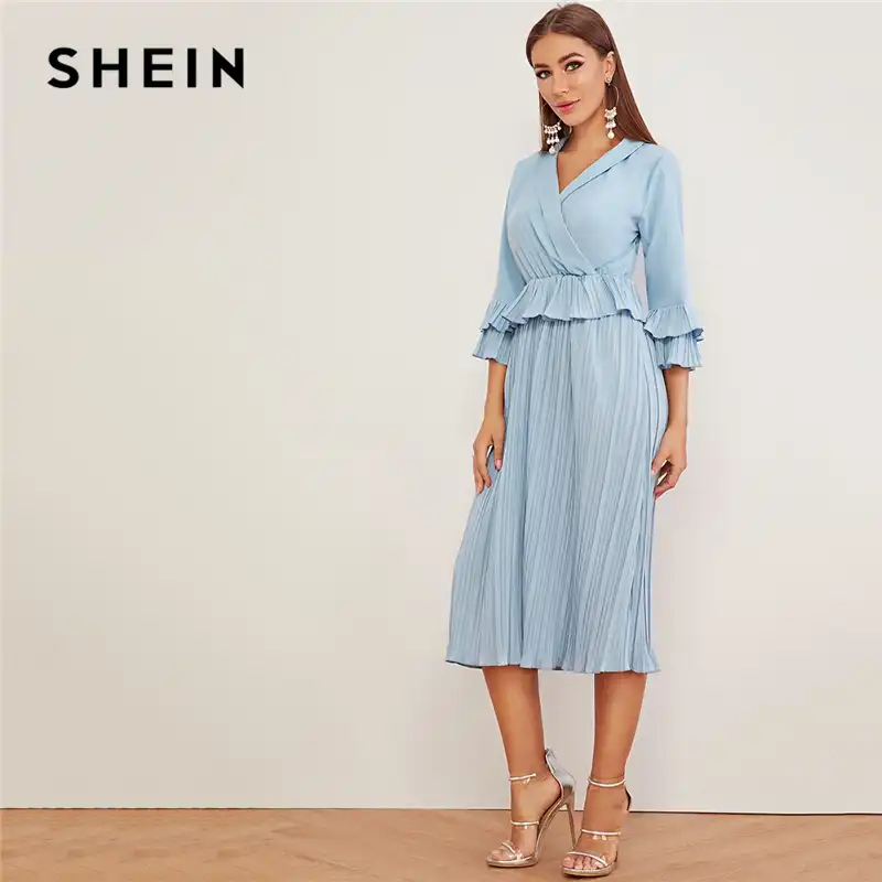 Shein Blau Ruschen Trim Volant Hulse Schal Kragen Gefaltetes Kleid Frauen Herbst Solide Eine Linie Hohe Taille Elegante Lange Kleider Kleider Aliexpress