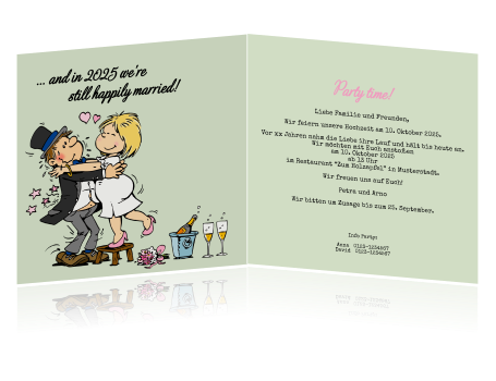 Pretty Orange DE > Hochzeitseinladungen > Silberhochzeit > Jubiläumskarte mit Cartoon Ändern Wähle Jubiläumskarte mit Cartoon von Belarto und 22 sind wir immer noch glücklich verheiratet Das ComicEhepaar auf dieser quadratischen Einladungskarte stimmt sofort frölich!. Hochzeitseinladungen online gestalten und drucken lassen Wir bieten Ihnen einzigartige Hochzeitseinladungsdesigns, die Sie in unserem praktischen OnlineEditor an Ihre Wünsche und Vorstellungen anpassen können Neben persönlichen Vorlieben wie Schriftarten, Farbwünsche und dergleichen können Sie Ihre Hochzeitseinladungen weiter. Kein Problem, wir haben unsere KartenOnlineauswahl breit gefächert.