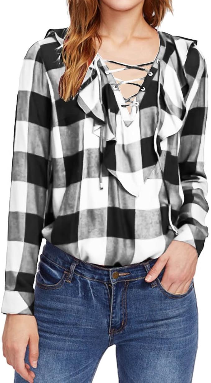 Vertvie Damen Bluse Hemd V Ausschnitt Volants Langarmshirt Tops Freizeit Elegant Hemdbluse Mit Schnurung Vorne Schwarz Und Weiss 2xl Amazon De Bekleidung