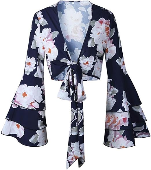 Langarm Tiefer V Ausschnitt Schnurung Vorne Geblumt Volant Ruschen Saum Weiten Glockenarmel Trompete Ballon Armeln Armel Kurze Crop Blouse Bluse Shirt Hemd Oberteil Top Amazon De Bekleidung