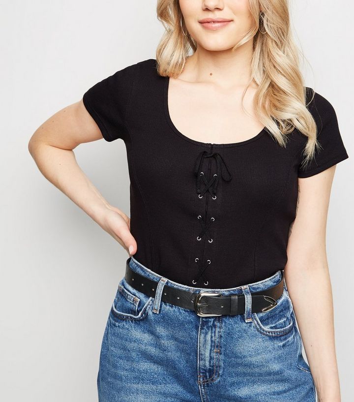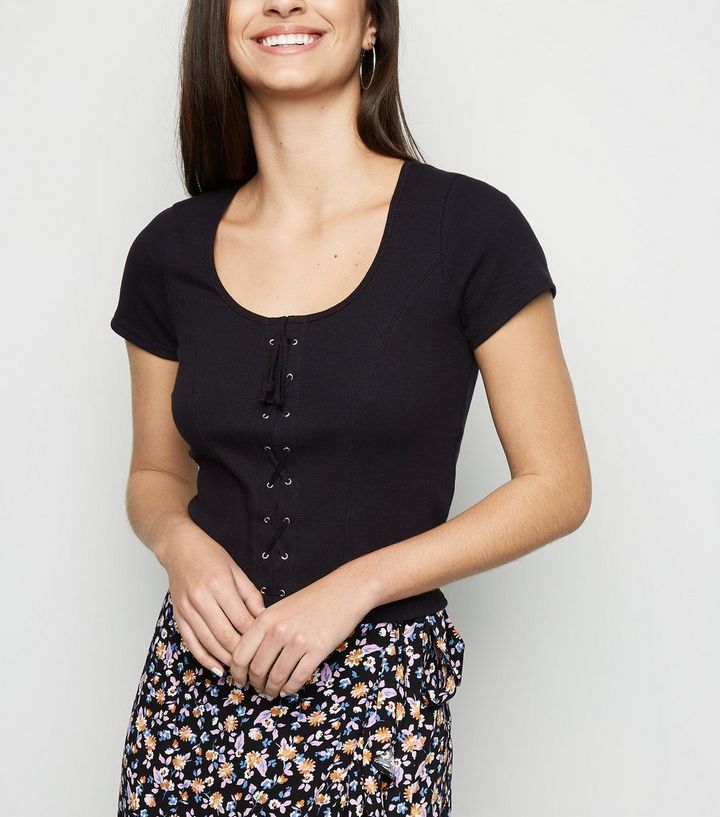 Schwarzes Geripptes T Shirt Mit Schnurung New Look