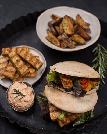 Lay on a clean dishtowel and fold the other half of the towel over top, pressing gently to extract excess moisture Then cut each slice in half lengthwise Mix the marinade ingredients (tamari to garlic) together Spread the tofu in a wide, shallow container and pour the marinade over. Place warmedup pitas on a work surface, fluffier side down Fill with lettuce, cucumber, tomato, onion, baked jackfruit pork and warm potato fries Gently fold the pitas over the filling, wrap in a piece of paper and tie with a string Serve with a generous dollop of tzatziki. Sprinkle generously with salt on both sides and allow to rest for 5 minutes Wrap cucumber slices in paper towels, squeeze excess liquid out, and transfer to a food processor or blender Add remaining sauce ingredients to blender and pulse until smooth and creamy Cover and chill until ready to use.